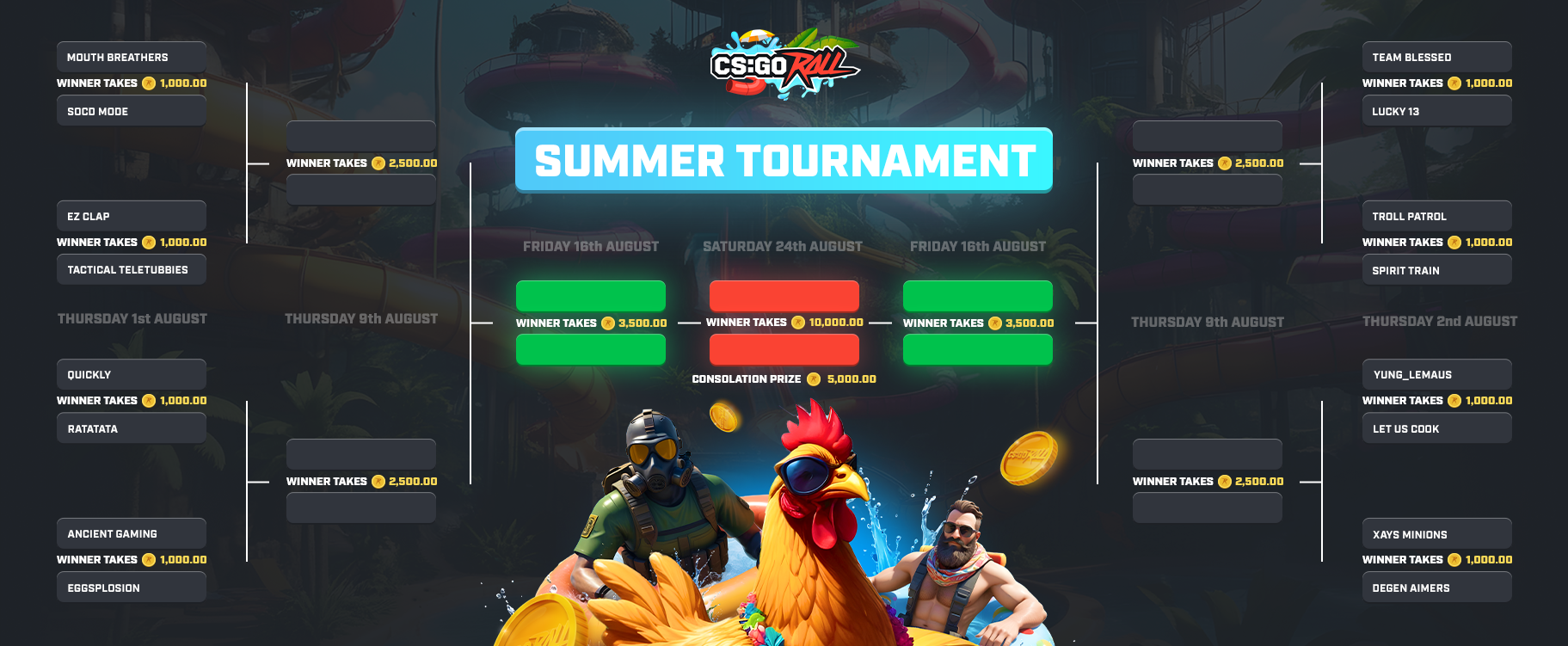 On August 1st and 2nd, our teams will play in 8 knockout rounds. The winners will then compete in a series of best-of-three matches, culminating in a grand final where the last two standing will face off for the ultimate prize - 10,000 coins!