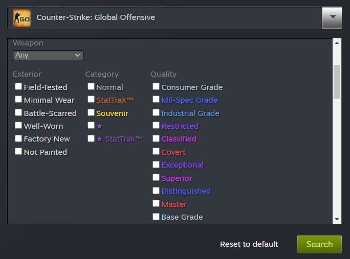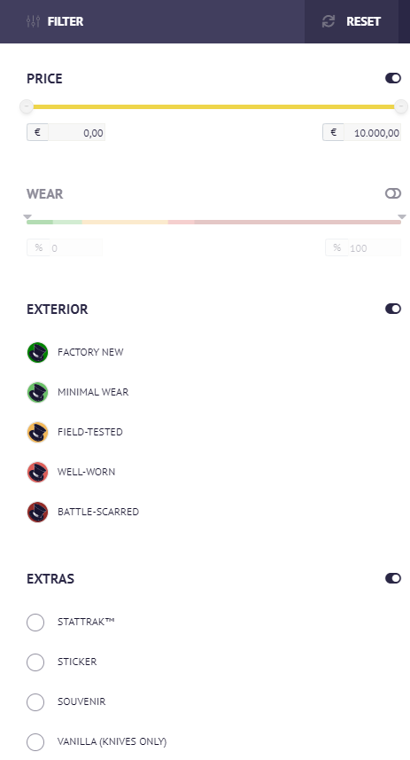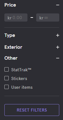 The examples above are from different marketplaces just to provide a filter reference as they do not have any relation with CSGORoll directly. Keep in mind that CSGORoll is focused horizontally instead of vertically, so don't limit yourself to the example provided.