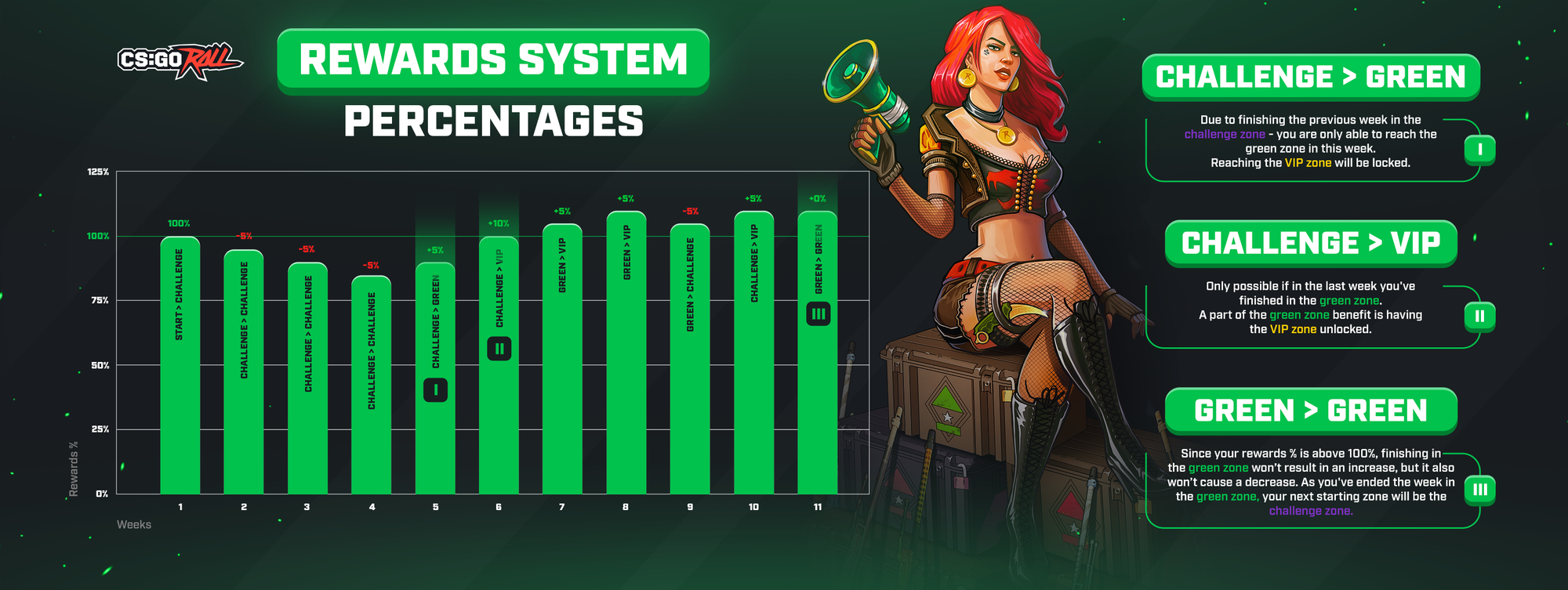 - → Green Zone (solid rewards +5%, stays the same if above 100%)