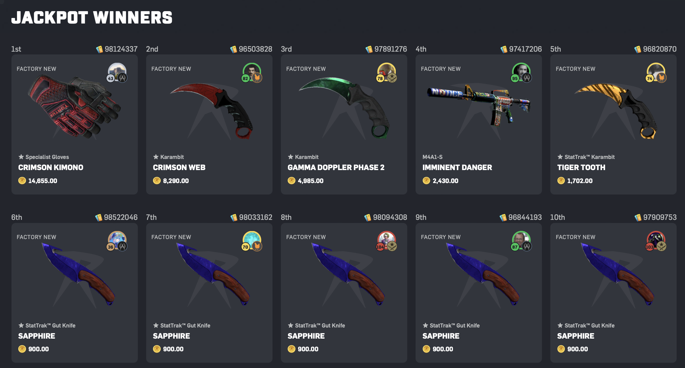 We hosted TWO jackpots during the third week of our summer event! On Tuesday 13th August, we split 50,000 coins between 100 players. In first place, Bampot from Team Counter-Terrorist won a pair of Crimson Kimono Specialist Gloves worth 14,655 coins. In second place, Benne from Team Chicken won a Crimson Red Karambit worth 8,290 coins. And in third place, Prototype_TB from Team Terrorist won a Gamma Doppler Phase 2 Karambit worth 4,985 coins.