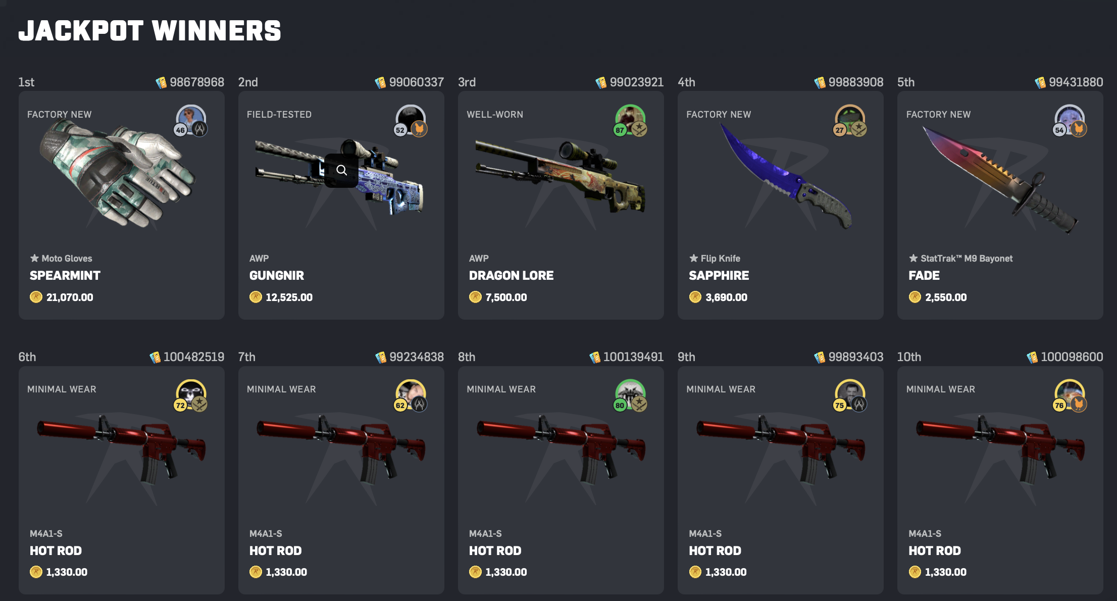 Then, on Sunday 18th August, we hosted our first 75,000 coin jackpot. In first place, LWAZ from Team Counter-Terrorist won a pair of Spearmint Moto Gloves worth 21,070 coins. In second place, OGROPSU2.0 from Team Chicken won a Gungnir AWP worth 12,525 coins. And in third place, Smedsnizzle from Team Terrorist won a Dragon Lore AWP worth 7,500 coins.