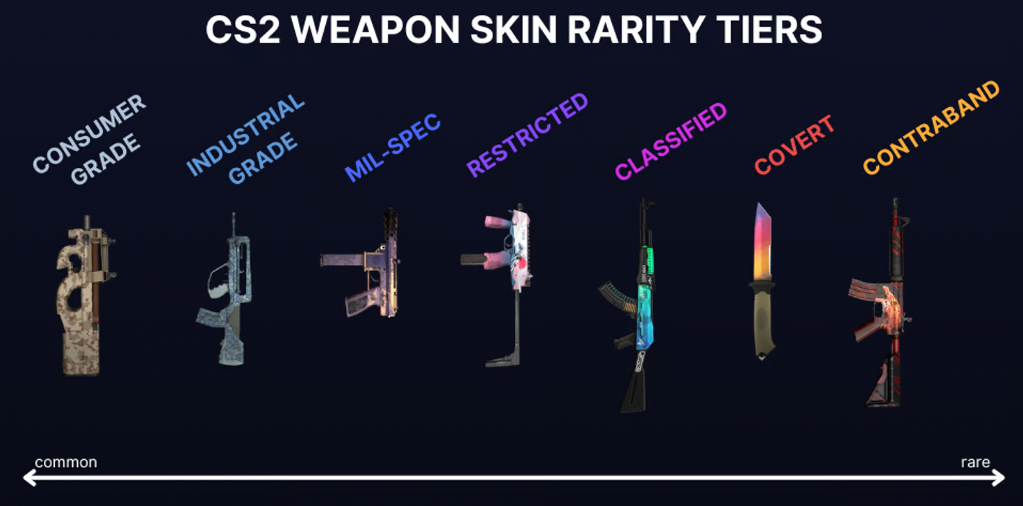 CS:GO skins have unique features that contribute to their value. But above all else, one of the most important is their rarity. Here’s a rundown of the eight rarity grades, from the least rare to the most rare.