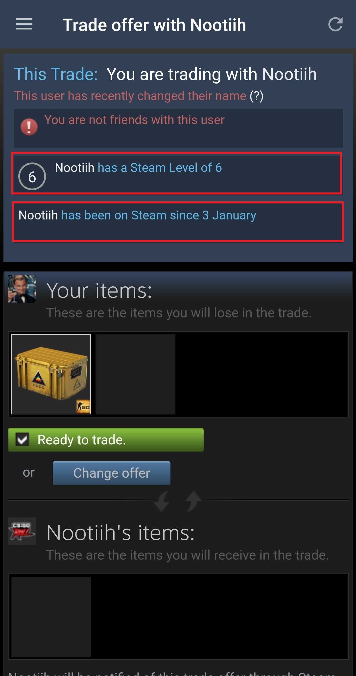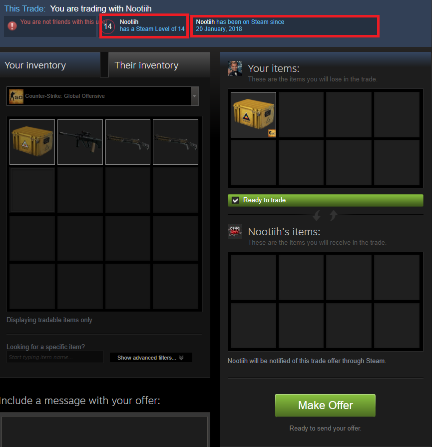 Can you spot the difference? Although the information appears the same, it isn't! The Steam profile Level and registration date are different! Voila, you've spotted the scammer. If you want to go even further, take a look at your trading partners profile to see how it differs from the moment you sent the offer.