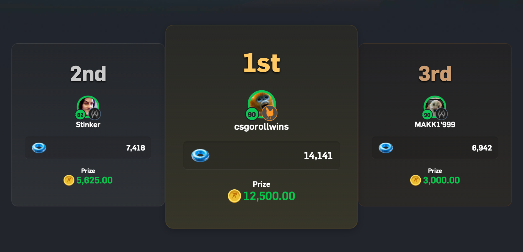 In first place, Csgorollwins collected 14,141 swim rings to win 12,500 coins. In second place, Stinker collected 7,416 swim rings to win 5,625 coins and in third place, MAKKI'999 collected 6,942 swim rings to win 3,000 coins.